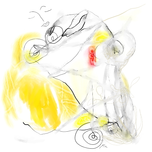 Eine Frau sagte sanft ein paar Worte in mein rechtes Ohr, so daß ich davon erwachte und schnell erstaunt laut “Ja?” in das dunkle Zimmer fragte, denn ich wollte sie auf keinen Fall verpassen. Gelb war ihre Farbe. Etwas in Form einer Triangel, gewebt aus hauchdünnem Faden.
