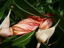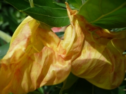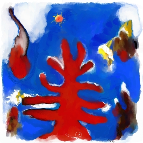 Ich träumte auch, daß ich den großen Oleander vor der Werkstatt mit dem Gartenschlauch gieße. Im Traum steht der Oleanderstock auf einem Holzstuhl. Das Wasser sprudelt in einem hohen Bogen aus dem Schlauch in den Topf mit dem Oleander. Etwas weiter links steht eine große Blumenschale aus Kunststoff ebenfalls auf einem Stuhl oder einem Hocker. Sie ist geringelt. Da spritze ich dann auch Wasser mit dem Schlauch hinein. Auf einmal kippt die Schale von dem Hocker und ich sehe, daß zwei große rotgelbe Äpfel in etwas klarem Wasser in der Schale sind.