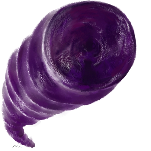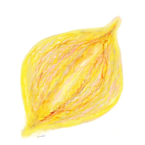 Ich träumte von diesem da. Ist es eine Frucht? Die Frucht, sie war sehr groß, im Durchmesser mindestens eineinhalb Meter, und zur Hälfte aufgeschnitten, wurde, glaube ich, auf einer Straße entlanggezogen. Sie leuchtete sehr und sah äußerst ungewöhnlich aus.