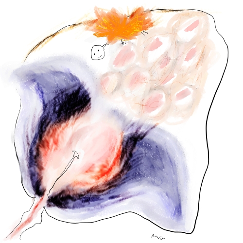 Beim Aufwachen träumte ich, daß ich eine rosafarbene Blüte vor blauem Hintergrund mit Pastellkreide male.