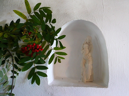 Links neben den Treppenstufen hoch zur schlichten aber schönen Eingangstüre mit Guckloch das Gefäß für das Weihwasser.