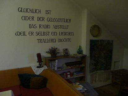 Eine Schwester führte uns ganz nach oben unters Dach in unsere Zimmer. Sperrte am Ende der Treppe eine breite weiße Türe auf. Die Zimmer und auch der ehemalige Gemeinschaftsraum sind immer noch in dem Zustand wie damals, als es das Mädcheninternat noch gab. Im zweiten Stockwerk ist das Heim für die Kinder und im ersten Stockwerk befindet sich der Raum, in dem morgen das Seminar stattfinden würde. Dort trafen wir auch eine Frau, welche gerade einen Blumenschmuck in der Mitte des Zimmers arrangierte. Wir sprachen miteinander. Sie war sehr nett und berührte beim Reden kurz meine Hand, so als würden wir uns schon ewig kennen. Sie nannte uns auch Gastwirtschaften im Ort, wo wir etwas essen konnten. Die Nonnen sprachen von einem Mann, der noch käme. Später bemerkte ich endlich, daß sie meinen Freund damit gemeint haben, der aber kurzfristig doch nicht mitgefahren ist.