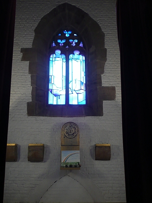 Ein Blick zwischen den dunkelroten Samtvorhang hindurch in den kleinen Kapellenraum, der neben dem größeren Raum liegt, in dem wir Tai Ji üben. Auf dem Altar mit der goldenen Schnecke liegt eine langstielige Rose. Stehen vier Kerzen. Und dort steht auch ein Bild mit einer Wiese und mit einem Regenbogen.