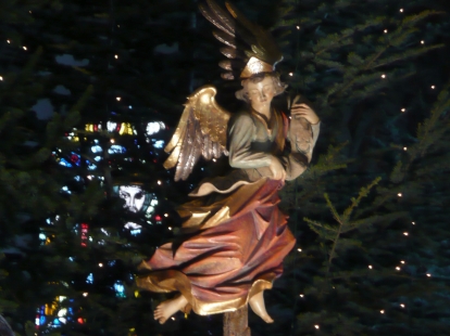 Nach dem Mittagessen sind wir in die schlichte Kirche des kleinen Ortes gegangen, denn dort war eine Grippe vor dem Altar aufgebaut, über die am Morgen auch schon auf dem Fernseher berichtet worden ist. Sie erzählte davon ganz begeistert und sagte, daß wir nach dem Mittagessen alle miteinander hingehen könnten, um sie zu betrachten. Wir waren dann aber doch nur zu zweit. Die Grippe anstatt des Altars ging über die ganze Breite der Kirche. Links stand ein markanter, riesenhafter, grauer Baumstumpf - Sturmholz -, an dem viele dieser scheibenförmigen Pilze wuchsen und in dessen schützender Höhle die heilige Familie war, das Kindlein in der Krippe lag. Aus dem dicken, graugrünen Moos, mit dem die ganze Länge der Krippenlandschaft ausgelegt worden ist, wuchsen an manchen Stellen üppig Alpenveilchen rosenrot und weiße Christrosen. Das Moos sah so weich aus. Dahinter hohe Tannen, die über und über von winzigen Lichtern leuchteten, wie als sei ein glitzerndes Netz über sie gebreitet worden. Oben darüber der goldene Stern mit einer himmlischen Wolke darin. Und der Engel Gabriel. Dahinter, im Glasfenster, ein Gesicht.
