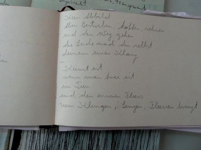 Wieder daheim fand ich eine Weihnachtskarte von Josefine auf meinem Schreibtisch. Sie schrieb mir ein schönes Gedicht, was ich ebenfalls gerne hier herein stellen möchte. Es kam mir wie eine Resonanz, ein Widerhall auf den eigenen Traum vor. - Ich war dann doch ziemlich müde von dem schönen Tag und der mehrstündigen Fahrt und jedes Mal wenn ich meinen Kopf nach unten gebeugt habe um den Rucksack weiter auszupacken, wurde mir schummrig und dunkel.