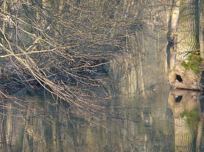 Das Haus war von einem Netz von Bächen umgeben, in denen sich der klare Himmel und die Morgensonne spiegelte. Es war eiskalt. Dampf stieg still vom Wasser auf und die weiten Felder glitzerten vom Reif. Als ich den Weg durch ein schattiges Stück zurück zum Wagen ging, zeigte ein heller Lichtstrahl, welcher schräg durch die dunklen Zweige der Erlen stieß, auf einmal genau auf die linke Seite meiner Brust. So als wolle er sich dort hineinbohren. Wie ein langer, goldener Finger von irgendwo her, der das Dunkel durchbrach. Was ist das jetzt?, überlegte ich erst träg, mit anderen Gedanken beschäftigt, das ist ja ein Sonnenstrahl! Und verfolgte ihn erstaunt zu seinem Ursprung zurück. Da kam noch ein zweiter hinzu! Entzückt beobachtete die beiden tanzenden Sonnenstrahlen, welche, je nachdem, wie ich ging oder wie ich mich bewegte, lustige Kringel überallhin auf meinen Körper malten.