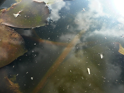 Etwas saß mitten im leeren Hof, etwas, es bewegte sich. Was ist das denn, ein braunes Blatt? Yoda, der rote Kater sprang hin und ich ihm nach. Da saß ein großer brauner Frosch auf dem Asphalt. Weiß Gott, wo der auf einmal hergekommen war! Vielleicht hat er in einem Garten in der Nähe überwintert. Hob ihn mit Hilfe einer Kehrichtschaufel auf. Vorsichtig. So ein Frosch hat ganz schön viel Kraft. Stetig und unermüdlich drückte er gegen das Innere meiner Hand, das hätte ich gar nicht erwartet. Einmal gelang es ihm zu entwischen und er landete mit einem schweren Platsch auf dem Teer. Blieb aber anscheinend unverletzt. Trug ihn hinunter zum Bach und setzte ihn im Moos am Ufer ab.