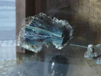 Am Morgen träumte ich von einem schönen kleinen Stein. Er hatte eine besondere Form, hatte einen langgezogenen Zapfen. Er war türkisblau mit einer schwarzen Maserung. Dann von Holzfiguren, Figuren aus dunklem Holz, sie ähnelten Marionetten, waren aber ohne Kleidung, die irgendwie zerlegt waren. Dann von einer Uhr an der Zimmerdecke. Sie sah aus wie unsere alte Eßzimmeruhr, welche von ihrer Form her einer schwarzgoldenen Blüte glich, allerdings war sie nicht rund, sondern herzförmig. Eine Herzuhr. Und noch von einem kleinen Tier mit einem schwarzen Fell auf den Kieselsteinen der Terrasse. Es hatte einen Silberstreif auf seinem Rücken.