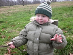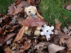 Meine Freundin aus London sandte mir heut einen Gruß. Ihre kleine Tochter und deren Teddys. Der Teddy liegt mit einem Blatt zugedeckt im Herbstlaub und schläft.