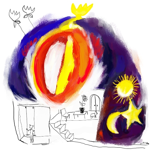 Ich hatte einen Traum, in dem neben den beiden Katzen noch ein drittes Tier bei mir Zuhause lebte. Es steht gerade auf meinem Sofa, während die beiden anderen Katzen irgendwo in einiger Entfernung auf dem Boden sitzen. Es sieht ein wenig ungewöhnlich aus. Es hat ein wuscheliges, orangeschwarz getigertes Fell, ist vielleicht so groß wie die kleine Katze und gleicht von seinem Aussehen eigentlich auch ein wenig einer Katze. Bis auf sein tigerhaftes Fell. Sein Rumpf hat eine längliche Tonnenform. Aus seinem Gesicht blicken zwei grünschwarze Kugelkulleraugen groß in die Welt hinaus und mitten auf seinem Kopf, vorne auf der Stirne, da hat es einen seltsamen, dünnen Fortsatz, der da herausgewachsen war. Dieser Fortsatz ist nicht mit Fell bedeckt und sehr beweglich. Er ist so etwas wie eine lange, hochempfindliche Antenne, ein Fühler. Oben, an seinem Ende, hat dieser biegsame Fühler eine Verdickung. Vielleicht sitzt dort ein Sensor. Oder es ist so, wie bei einem Leuchtkäfer. Und dieses kleine Tier verfärbte sich auf einmal, ohne das ich einen Grund dafür erkennen konnte, mit seinem ganzen Körper apfelrot. Sein Fell war auf einmal verschwunden, es stand sozusagen nackt da, und seine nun sichtbare und sehr glatte Haut glühte apfelrot! Errötet tief und vollkommen. (Aber das verstand ich während des Traumes nicht, vielmehr beobachtete ich sprachlos das Tier und diese seltsame Veränderung an ihm.)