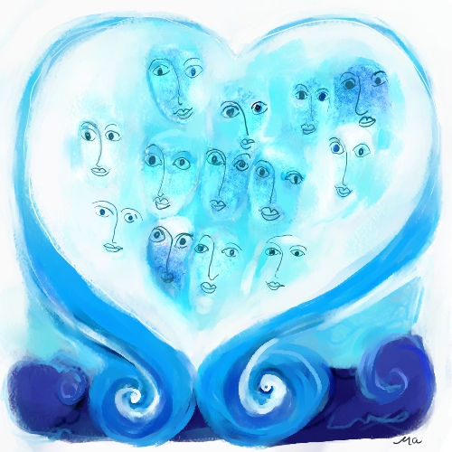 Das blaue Herz. Hellblautürkis. Wie das Meer an manchen Sommertagen. Auf einmal erkannte ich in dem hellen Blau viele Gesichter, die hervortraten. Aus der Bläue. Auch die Gesichter waren ganz blau, ihre Haut. Das Gesicht eines Mannes, zum Beispiel. Sie sahen mich an. Wie aus einer anderen Welt.