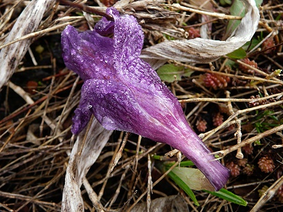 Vor der Türe ein Lavendelzweig auf dem nassen Asphalt.