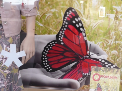 “La puissance qui change la vie” stand auf dem Werbeplakat mit der kleinen schelmisch blickenden Meerjungfrau. Im Fenster rechts daneben, kaum erkennbarer, ein kleiner purpurner Schmetterling.