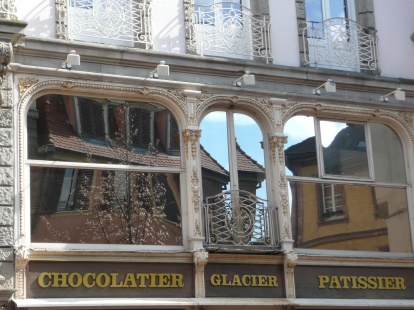 In dem oberen Fenster spiegelte sich ein Baum, das Laub des letzten Jahres bewegte sich im Wind. Und in den Auslagen darunter hofften kunstvoll verpackte Fische aus Schokolade auf hungrige Mäuler.