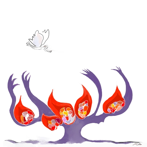 Der Gärtner, das denke ich stets beim Anblick des Gemäldes. Das Geäst des Granatapfelbaumes auf dem Goldgrund ist voller Vögel. Er blüht - und gleichzeitig reifen die Früchte an seinen Zweigen. Er blüht orangerote Federn. Er blüht Vögel. Vogelknospen. Herzvögel. Eine rosafarbene Rose rankt über dem Weidenzaun.