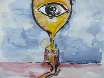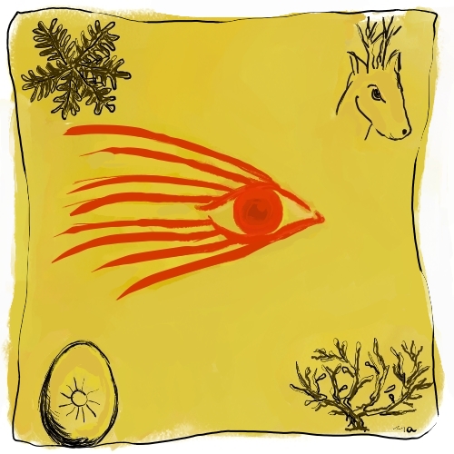 Das habe ich geträumt. Eigentlich war es nur das rote Auge mit dem Sternenschweif auf einem goldbraunen Grund. Vielleicht wie eine Lederhaut. Vielleicht ist es etwas Indianisches. In den vier Ecken waren vier Zeichen mit schwarzen Pinselstrichen hineingemalt, die ich aber nicht weiter erkennen konnte. Ich habe das Bild jetzt mit vier Zeichen meiner Wahl vervollständigt. Ich habe für mich gewählt: Das Zeichen links oben ist eine glitzernde Schneeflocke. Das rechts oben ist ein Reh mit sanften Augen. Das rechts unten ist eine feingliedrige, zarte Koralle. Und das Zeichen links unten ist ein Ei mit einer Sonne. Ein Sonnenei.