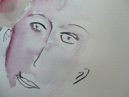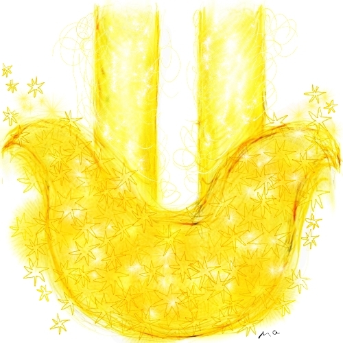 Dieses innere Bild bezieht sich auf eine Meditation bei dem Seminar über den Isenheimer Altar im letzten Frühjahr in Colmar. Die Gruppe traf sich am Abend in ihrem Hotelzimmer. Das war auf eine Weise sehr intim und heimelig. Auf dem Tischen in der Mitte lagen das Aufnahmegerät und einige Süßigkeiten. Wir im Kreis auf Stühlen und auf dem Bett. Es war das erste mal für mich, in einer Gemeinschaft und in Gegenwart einer Lehrerin zu meditieren. Das Bild bedeutet, daß sich zwei Lichtsäulen wie aus einem glitzernden Fluidum rechts und links des Menschen bilden. Herabkommen. Obwohl das Wort “herabkommen” vielleicht nicht ganz treffend dafür ist. Vielleicht eher Segen. Ja, Segen. Diese Säulen kommen also herab und der Mensch wird dadurch licht, gereinigt, schmilzt, und kann Dankbarkeit entwickeln. Die Dankbarkeit gleicht einer kelchförmigen, einer blütenförmigen, einer gelb flutenden Welle mit tausend Sternen, die sich voller Fülle wieder ins Außen ergießt, die er dann wieder nach außen abgibt.