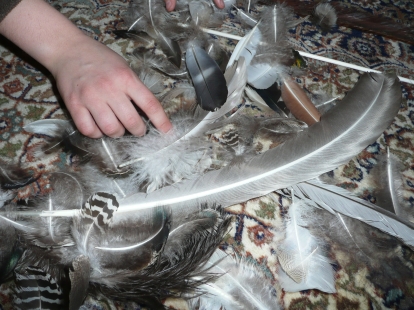 Ich habe Hans um zwei Federn gebeten, deshalb breitete er seine Schätze vor mir aus. Er gab mir dann vier kleine Federn zur Auswahl mit nach Hause, zwei die ein Pfau verloren hatte und welche an ihren Spitzen grünblau schillerten, und zwei braunweiß gestreifte von einem Greifvogel. Von einem Adler, wie er sagte.