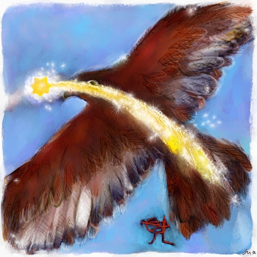 Heute träumte ich noch einmal von dem Adler am Himmel. Von dem Sternbild, durch das in dem Traum vor einigen Tagen eine Sternschnuppe kometengleich geflogen ist. In dem Traumbild, das gegeben wurde, sah ich das Bild, welches ich gestern gemalt habe, verändert. Der Hintergrund, der Himmel, war jetzt nicht mehr dunkel- sondern türkisblau und der Adler in Rotbrauntönen. Es wirkte dadurch viel freundlicher und fröhlicher. Das Türkis ist das Türkis der indianischen Völker. Das Besondere war aber vor allem noch, daß der Adler mit seinen ausgespannten Flügeln zugleich der gespannte Bogen des Schützen war. Der gespannte Bogen war jetzt also über den Adler gemalt. Und der Pfeil war auch in ihm. Der abgeschossene Pfeil war der Stern mit seinem Schweif.