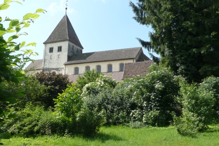 Ich machte einen Stopp in Reichenau, um die berühmten romanischen Kirchen anzuschauen. Während ich durch den Sommermorgen ging, traf mich plötzlich ein feuchter Tropfen auf der rechten Wange, der von dem blauen Himmel zu regnen schien. Es war von einem Vogel. Ein anderer kleiner Vogel sang jubilierend in einem Baumwipfel. Schwäne schwammen auf dem spiegelglatten See, der blaugrün funkelte.