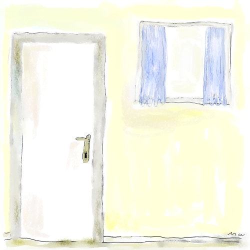 Ein Traumbild: Das Bild mit den aufgemalten, hellblauen Vorhängen neben der Türe hängt etwas höher als ein Bild normalerweise hängen würde. Es ist also kein Fenster, sondern ein Bild. Bis auf die Vorhänge ist es ganz weiß, ganz leer. Es ist weiter nichts darauf zu sehen. Und auch die Wand, an welcher es hängt, ist weiß.
