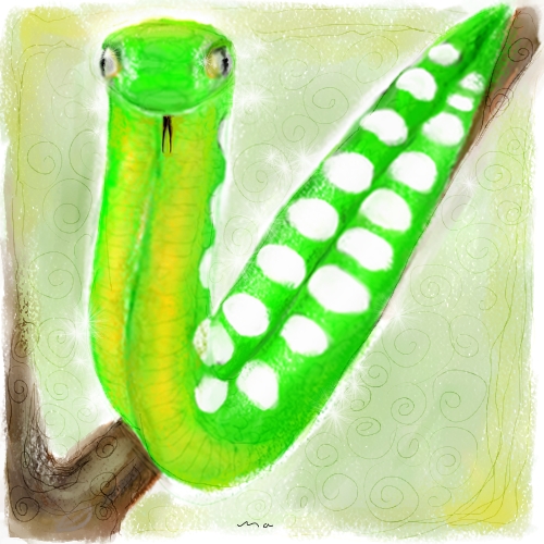 Ich träumte auch von einer Schlange. Von der Ferne sah es erst so aus, als säße eine grüne Raupe auf dem Ast. Doch dann erkannte ich, daß es eine Schlange war. Eine doppelte Schlange mit regelmäßig angeordneten, weißen Punkten auf ihren beiden Rücken. Sie stellte sich auf.