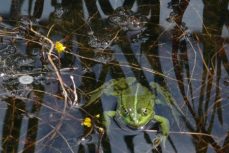 Die erste Seerose hat heute ihre Knospe geöffnet. Ihre Blütenblätter sind weiß und ihr Inneres ist so gelb wie eine Eidotter.