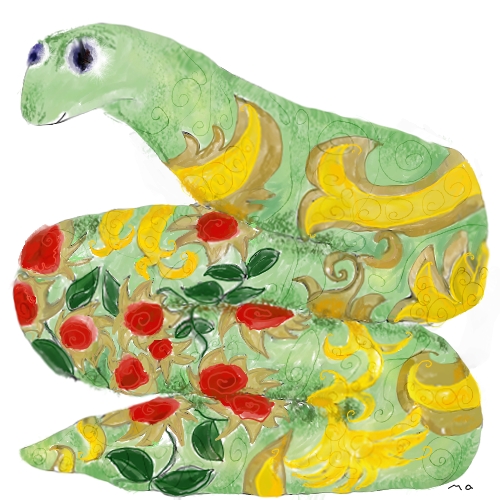 Ich träumte von einer Schlange, von ihrer Haut. Ihre Haut war ganz außergewöhnlich, sie war nämlich nicht glatt und schuppig, wie Schlangenhaut normalerweise ist, sondern von ihrer Beschaffenheit und Struktur her so wie die empfindlichen und zarten Flügel eines exotischen Schmetterlings. Pudrig, die feinen Pigmente brachen sich im Licht. Sie glich kostbaren, wunderbar komplex und aufwendig gemusterten Brokat und gleichzeitig war sie wie weich schillernder Samt. Ein Farbenspiel aus Rot, Dunkelgrün und Gold.