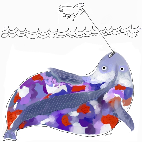 So angeln die kleinen Vögel die Fische für ihren Ritt zu den Sternen. - Dieser Fisch verspricht ein besonders gutes Reittier zu werden. Ein fetter Happen.