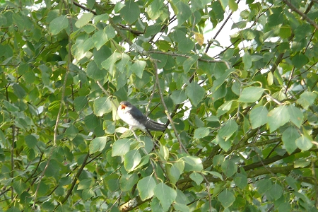 Am Morgen: Noch ein Jungvogel: Eine junge Schwalbe ruft ihre Eltern nach ihren ersten, noch recht ungelenken Flugversuchen aus der Birke am Bach.