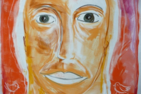 Und von einem rosafarbenen Tuch vor der unteren Hälfte meines Gesichtes.