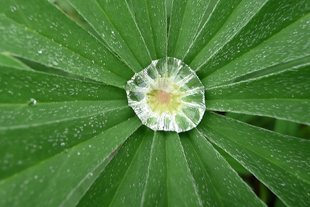 Die dunkelgrünen Blätter der Lupinen funkeln in der Dämmerung - kunstvoll übereinandergeschichtete Schirme.