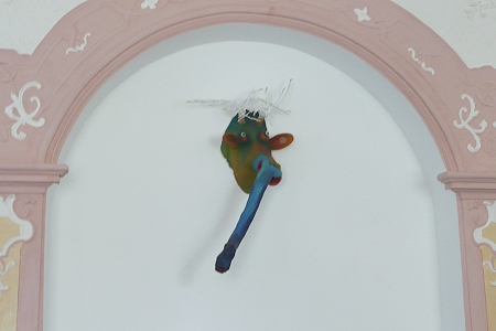 Ich war auf Schloß Oberschwappach und habe die Kunstausstellung angesehen. Das Foto zeigt eine lustige “Trophäe” von Ruthard Fella. Sie hing im Raum 3 über einer Sitzgruppe neben dem Ofen.