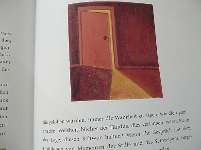 Auf seinem Einband ist ein Bild in einem Bild. Im Bild einer weiten, gelblichen Wüstenlandschaft das kleinere Bild eines Waldes. Mitten in dem Wald steht eine Türe aus rotbraunem Holz, die, das fällt mir jetzt auf, genau so aufgeht wie die Türe im Traum, nämlich nach innen, also zum Betrachter hin. Zu ihm hin. Der Türgriff befand sich, ebenfalls wie in dem Traumbild, rechts. Auf dem Bucheinband ist die Türe offen, sie steht weit offen, und dahinter ist ein blauer Himmel mit weißen Wolken zu sehen, in dem ein Regenbogen, eine Straße aus Regenbogen, hinein führt. In die Unendlichkeit.