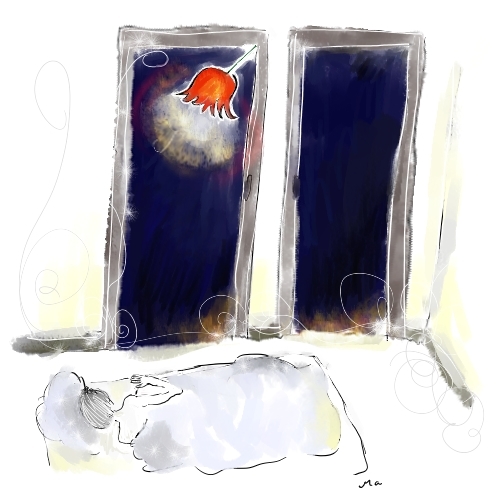 Ich habe von den drei Robinien an unserem Hof geträumt. Sie waren grün belaubt, obwohl es jetzt Winter ist. Ihre Blätter waren aber keine Robinienblätter, sondern die strahlenförmigen Blätter von Lupinen, den Blumen. In der Mitte eines jeden Blattes befand sich je ein großer Tautropfen, in dem goldenes Sonnenlicht leuchtete...