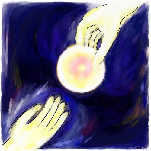 Hände halten Hände. Hände können sich nicht nur bewegen, können nicht nur “tun”, können nicht nur berühren, fühlen, sind nicht nur Tastorgan, sondern wir “atmen” auch durch unsere Hände.