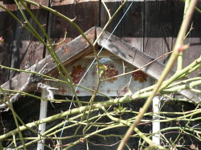 Ein Marienkäfer auf der Unterseite eines welken Blattes. Der Wald scheint blau. Kinder, die Rollschuh fahren. Zaghafte Sonnenstrahlen. Gurgelnder Bach. Ein winzigkleiner Vogel singt hoch oben auf dem Strommasten auf der Wiese hinter der Werkstatt. Eine Schar Meisen am Schlafzimmerfenster. Ich sah ein paar Mal ein Falkenpärchen am Himmel. Ich glaube, daß es Falken waren, die in so auffälliger Weise über das Haus geflogen sind. Turmfalken.