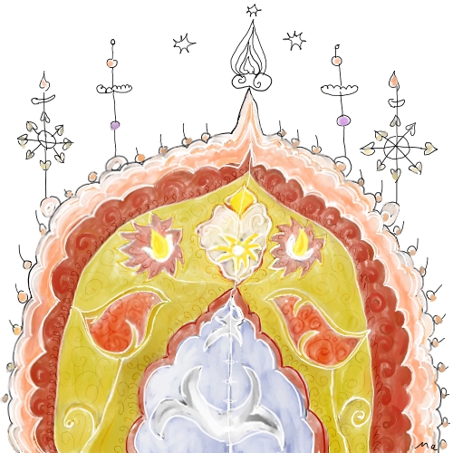 Sie tat uns nacheinander je einen Tropfen duftendes Öl auf die Mitte der Stirne, während wir still in Meditation saßen.