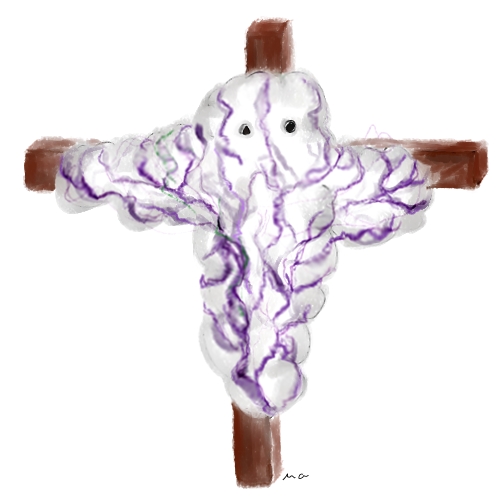 Ein inneres Bild, ein Seelenbild, von einem lilageaderten Geist am Kreuz.