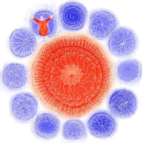 Ein Traumbild von dem Zodiakus, von dem Tierkreis mit seinem Zentrum. Im Zeichen der Fische ein Mann mit geöffneten Armen in einem roten Gewand, Jesus. Viele Strahlen gingen vom Zentrum dorthin. (Eigentlich sah ich in dem Traumbild nur das obere linke viertel des Tierkreises.) Besonders das rote Gewand war sehr eindrücklich, als läge eine besondere Bedeutung in ihm.