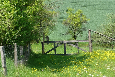 Hinter dem Stamm des Kirschbaums. Verborgen im Raps. An der gelben Wange.