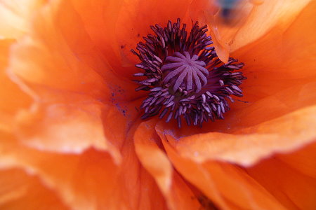 Die Biene fliegt, hat ihren Tanz unter dem purpurfarbenen, samtenen Dach im Zentrum des Mohns vor unserem Auge vollführt.