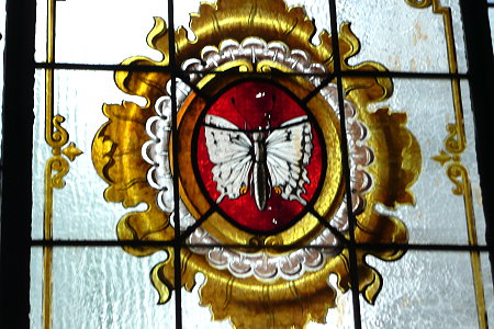 Fenster in der Kirche auf dem Michaelsberg. Heiliges Grab. Draußen Merkur mit dem Schlangenstab.