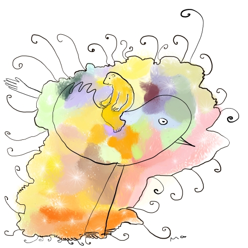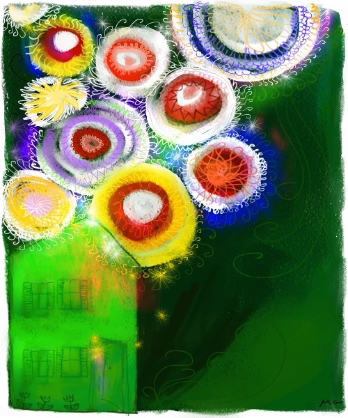 Das Bild bedeutet: Ein Flugobjekt, ein kugelförmiges Raumschiff, von rechts kommend am blauen Himmel. Perlmuttartig grün schillernd war es. Wunderschön. Blau. Violett.