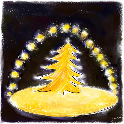 Der Tannenbaum aus goldenem Licht ist durch die Hilfe des Regenbogensterns aus der ebenfalls goldenen Spiegelfläche emporgewachsen. (Zu diesen Bildern gehören auch die beiden Bilder vom 17. und vom 21. Oktober.)