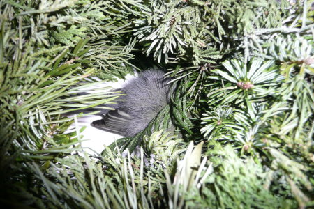 Es war kaum zu glauben, die kleine Meise hatte es sich mitten im Adventskranz auf dem Eßtisch für die Nacht gemütlich gemacht und schlief bereits tief und fest, ganz aufgeplustert und fast verborgen von seinem schützenden Tannennadeldach.