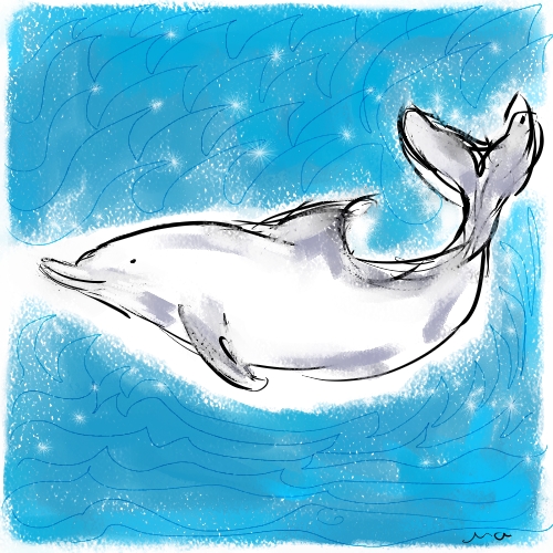 Der weiße Delphin schwimmt glücklich. Ich habe ihn jetzt mitten in türkisblaues Wasser hinein gemalt, damit er nicht mehr auf dem Trockenen liegt. Vielleicht ist er auch ein Bild für die Seele.