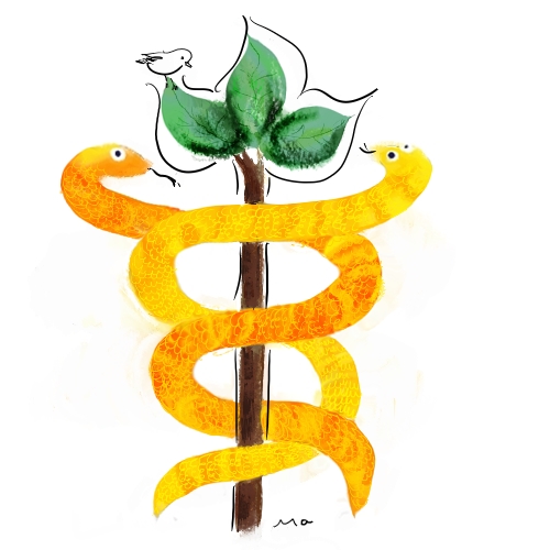 Aus dem mit zwei goldenen Schlangen umschlungenen Stab sind drei Blätter gesprossen. Auf eines hat sich dann sogar noch der kleine Vogel niedergelassen.