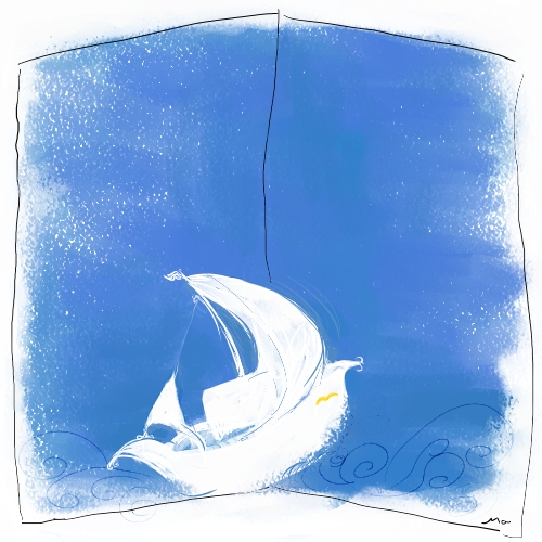 Ihr Flyer wird aufgefaltet. Innen ist er einfach gehalten, ganz ohne Schrift, ganz schlicht, man sieht nur ein gemaltes Bild, das sich über die beiden hohen, schmalen und blütenweißen Seiten erstreckt: das weite, tiefblaue Meer und vorne in der Mitte ein großes, weißes Segelschiff, das gerade abgelegt hat und nun in See sticht.