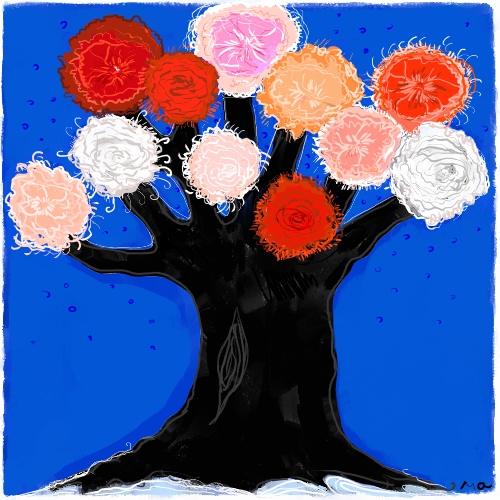 Der schwarze Baum, dessen Äste alle abgesägt worden waren, blüht jetzt Nelken.
